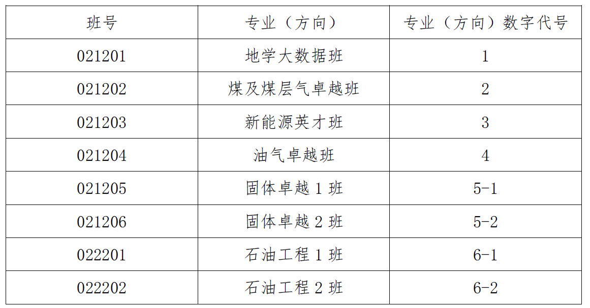 资源勘查工程专业分为金属矿产资源、油气资源、煤系资源、新能源、地学大数据方向,按基地班、卓越工程师班、英才班三种模式培养,基地班不参与本次专业方向确认。石油工程专业按卓越工程师模式进行培养。