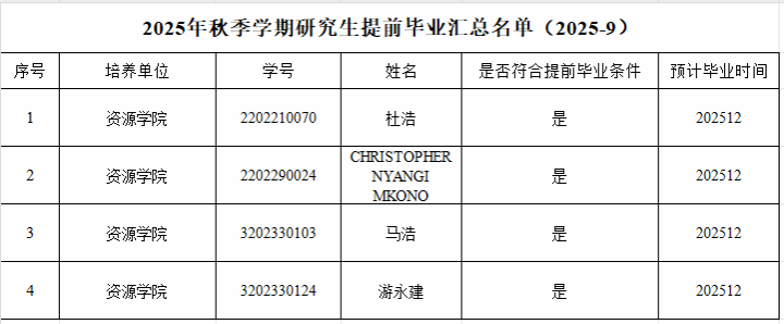 根据学校的相关通知要求,经研究生个人申请,学院初审,正妹AV 2023级硕士研究生(不含硕博连读、提前攻博研究生)、2022级博士研究生(不含直博生)、2020级直博生申请提前毕业名单如下,如有异议,请公示期内书面反馈意见至研究生科(联系人:周老师,办公室:主楼336,电话:67883627),公示期即日起至2025年9月22日。