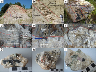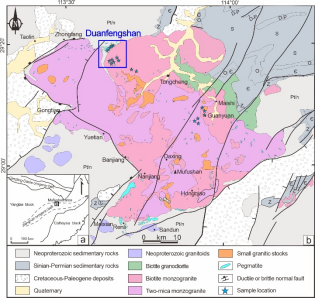 赵新福教授团队选取幕阜山北缘断峰山地区的伟晶岩及相关花岗岩体作为研究对象,对不同期次的花岗岩(图1)、赋存于花岗岩基内的贫矿伟晶岩(图2a-c)及赋存在片岩中的稀有金属伟晶岩(图2d-f)开展了详细的白云母矿物学和地球化学对比研究。