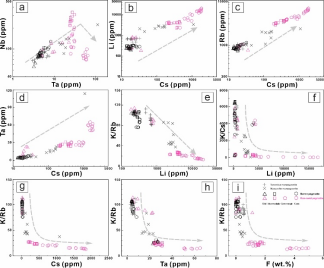 图4.各类花岗岩与伟晶岩内部分带中白云母微量元素含量与比值