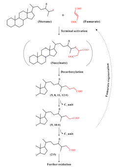 富马酸加成是广泛存在的烃类厌氧生物降解机制之一。在该机制中,烃类分子通过加成到富马酸被激活,所产生的初级代谢物最鲜明特征是其碳链相对于母体烃的延长。但目前仅在实验室模拟降解实验中检测出这类代谢物分子标志化合物,在油藏降解原油中尚未报道此类碳链延长的标志物。研究团队发现的“延长型”甾烷酸预示着油藏中甾烷可能通过富马酸加成被微生物氧化,即甾烷D环的侧链末端被激活而发生碳链延长反应。