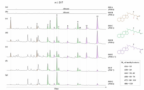 朱钢添副教授团队选取南襄盆地泌阳凹陷原油作为研究对象,通过气相色谱-质谱(GC-MS)、全二维气相色谱-飞行时间质谱(GC×GC/ToF-MS),系统分析了一系列母源关系接近但生物降解等级不同的原油样品中的甾烷酸分布。GC-MS分析结果表明,在未降解和低降解等级的原油样品中,未检出甾烷酸信号,只有在生物等级较高(规则甾烷开始发生明显降解)的原油样品中才能检测到甾烷酸,说明该类酸性生物标志物是甾烷的生物降解产物(图1)。