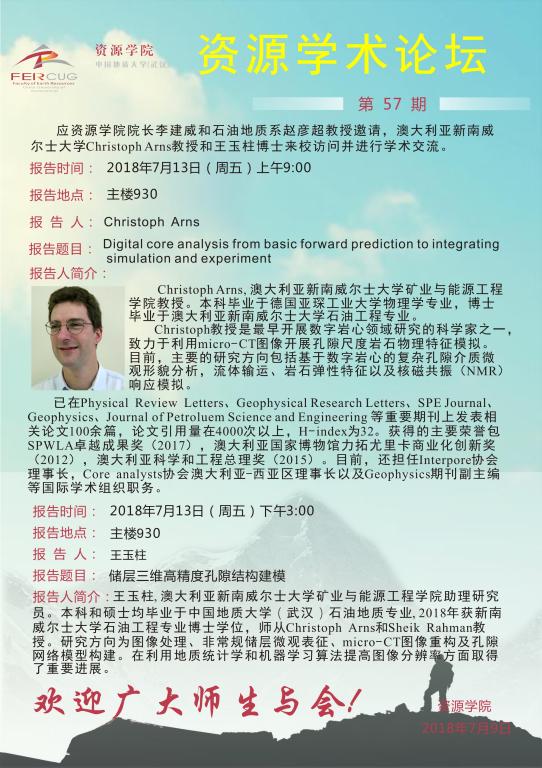 [7月13日]第57期资源学术论坛:Christoph Arns、王玉柱学术报告