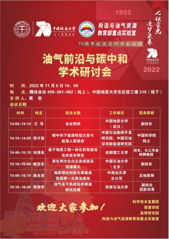 建校70周年校庆之际,举办“油气前沿与碳中和”学术研讨会,特邀行业內院士专家,聚焦油气前沿,抓住碳中和发展的关键机遇,开展油气和地热等新能源勘探开发理论和技术前沿研讨,推动有组织有前瞻性的研究和创新,为能源资源高效勘探开发提供理论与技术支持。