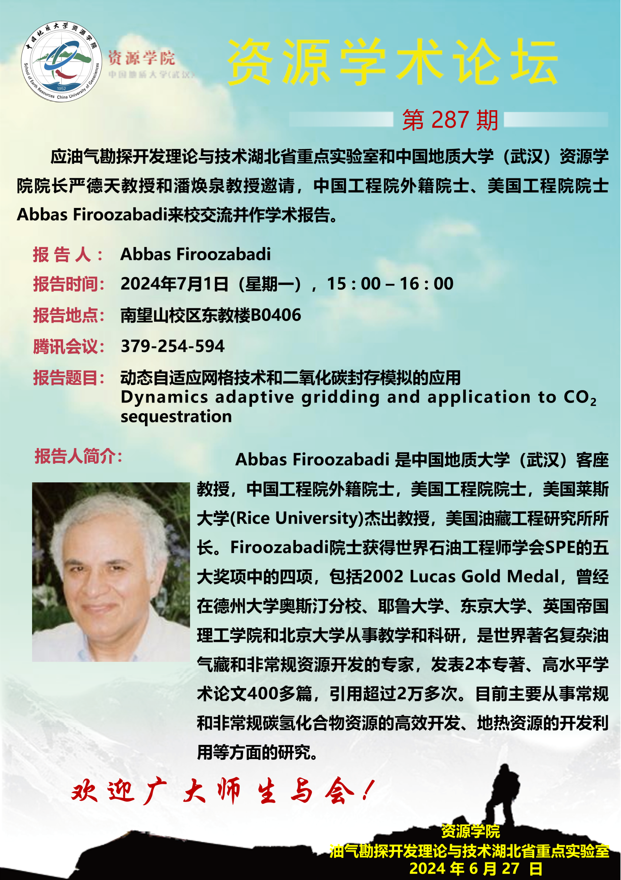 【7月1日】第287期资源学术论坛:Abbas Firoozabadi学术报告
