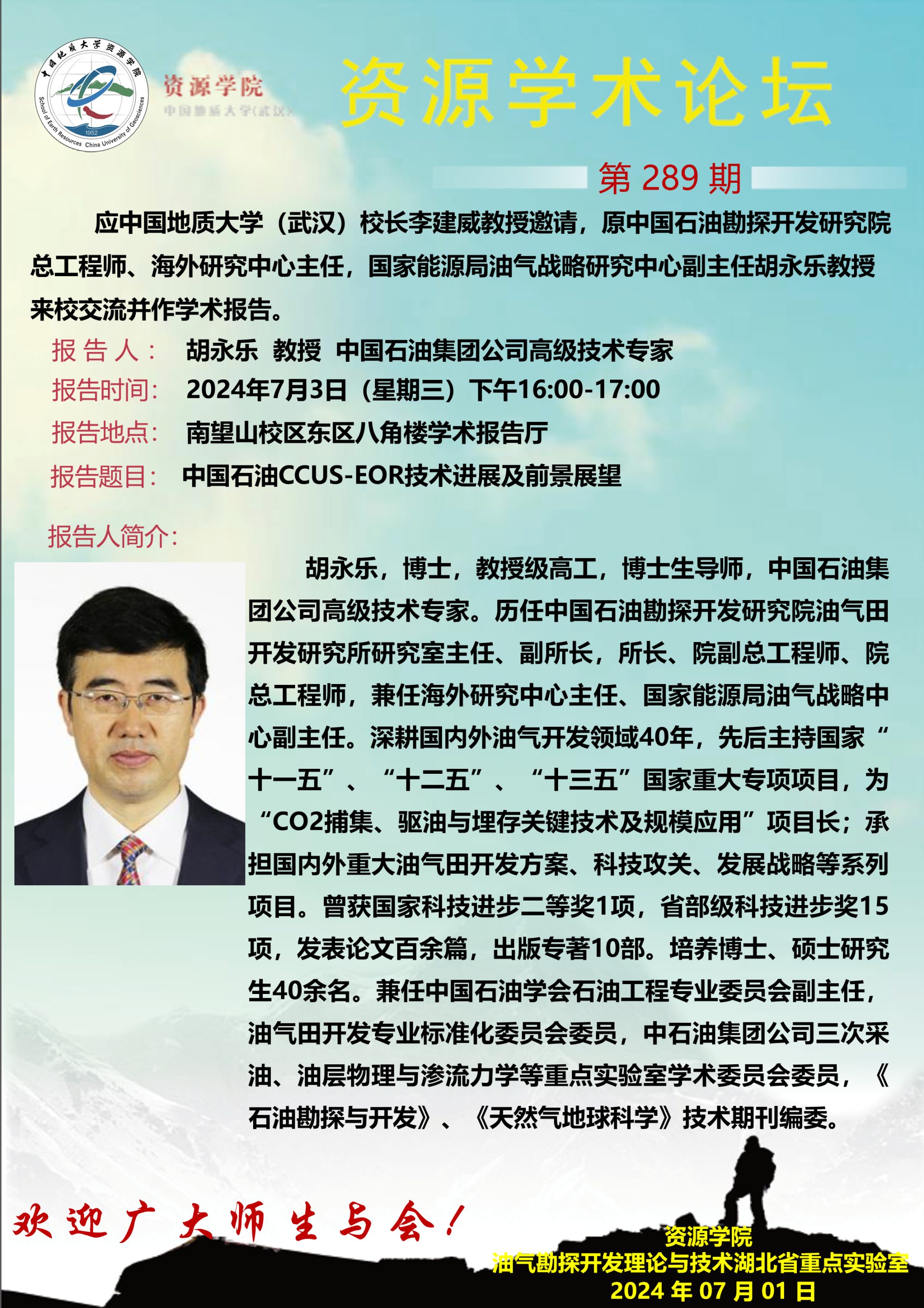 【7月3日】第289期资源学术论坛:胡永乐学术报告
