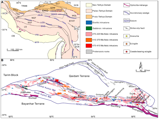 付乐兵副教授、魏俊浩教授及博士研究生赵旭、陈加杰等以青藏高原北缘的东昆仑造山带为研究对象(图1),对造山带内早古生代火成岩的时空分布和地球化学特征开展了系统研究,并取得主要认识如下: