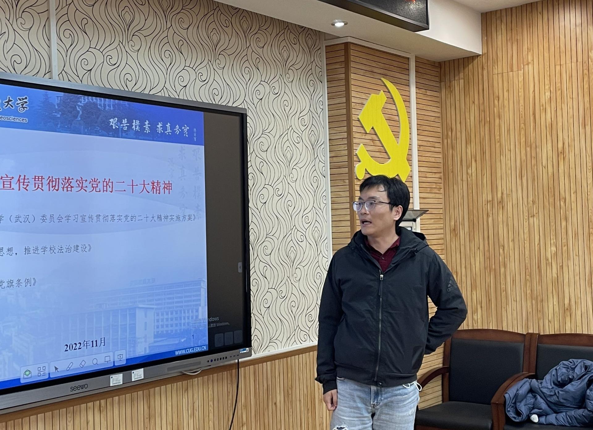 (武汉)委员会学习宣传贯彻落实党的二十大精神实施方案》、习近平法治思想和《中国共产党党徽党旗条例》等内容。张琪同志强调要把全体师生员工的思想和认识统一到党的二十大精神上来,把智慧和力量凝聚到党的二十大确定的各项任务上来,凝聚到实现学院“十四五”规划确定的各项任务上来;要加强法律制度的日常学习,认真执行民法典,加强网络法治宣传教育;要规范使用中国共产党党徽党旗。与会者纷纷表示作为党员责任重大、使命光荣,要把党的二十大精神学习融入到实际教学、科研工作中。
