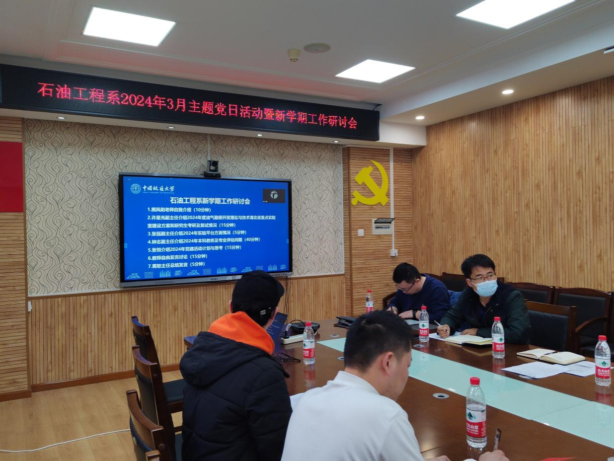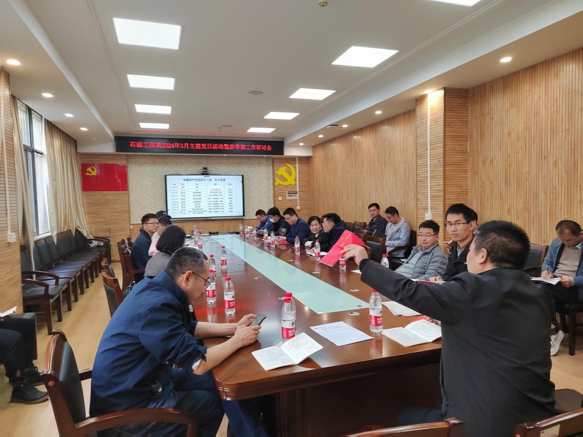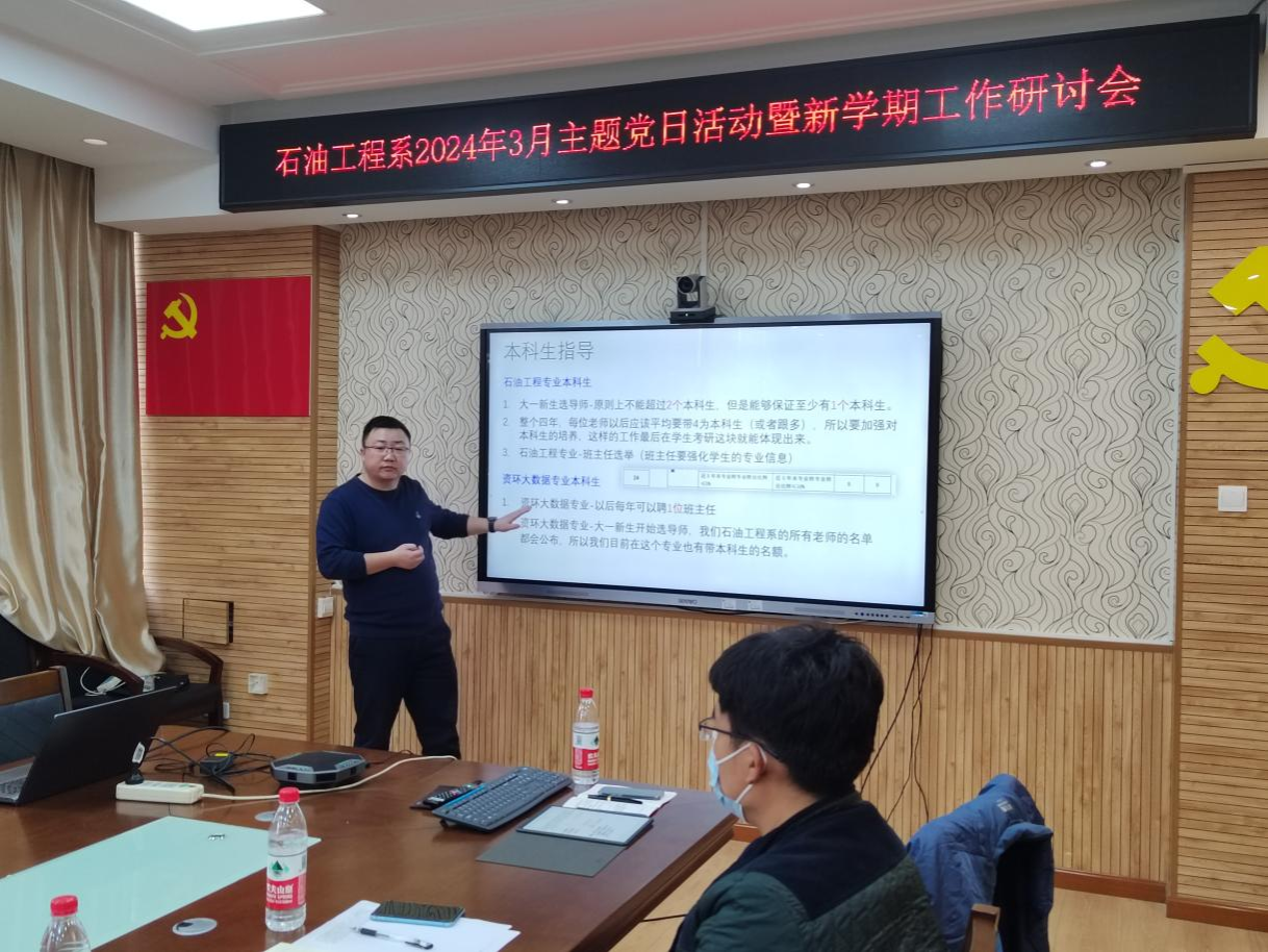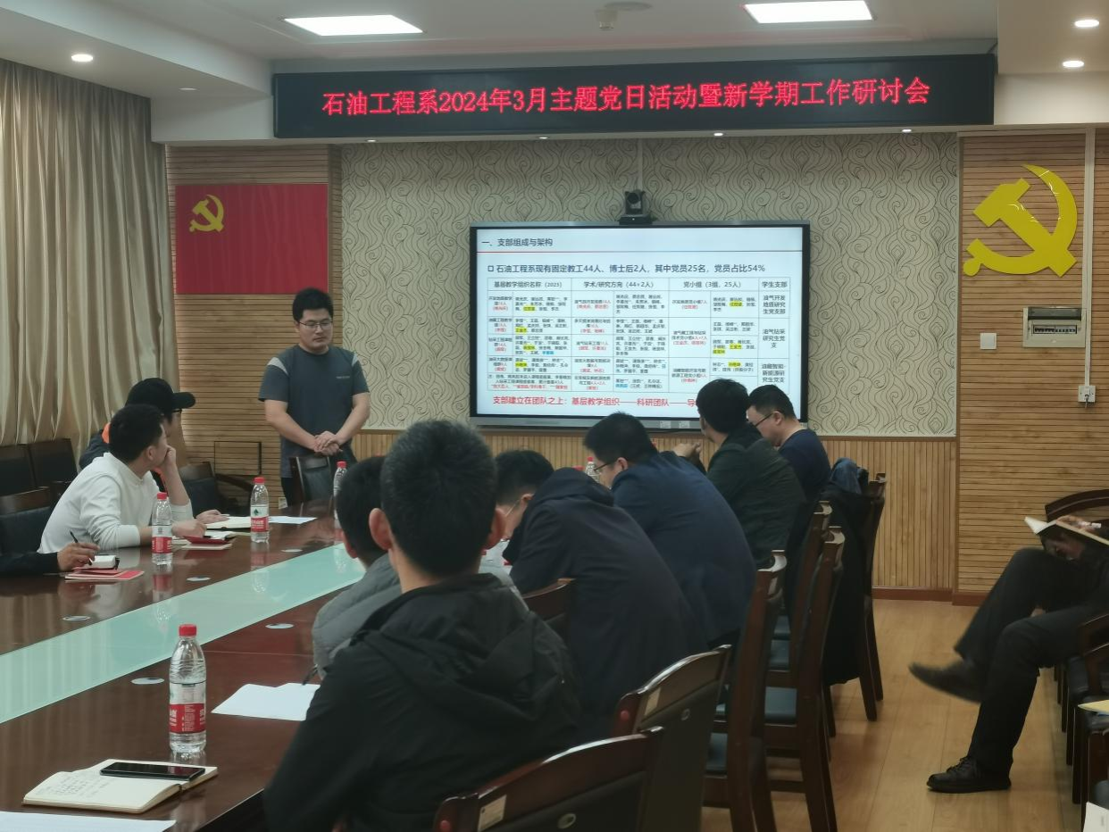 石油工程系党支部开展2024年3月主题党日活动和新学期工作研讨,会议主题为“学习全国两会精神,砥砺奋进担当作为——直面问题、勠力同心,推动石油工程学科建设”。石油工程系全体教师、学生党支部书记参加会议。支部书记张恒主持会议。