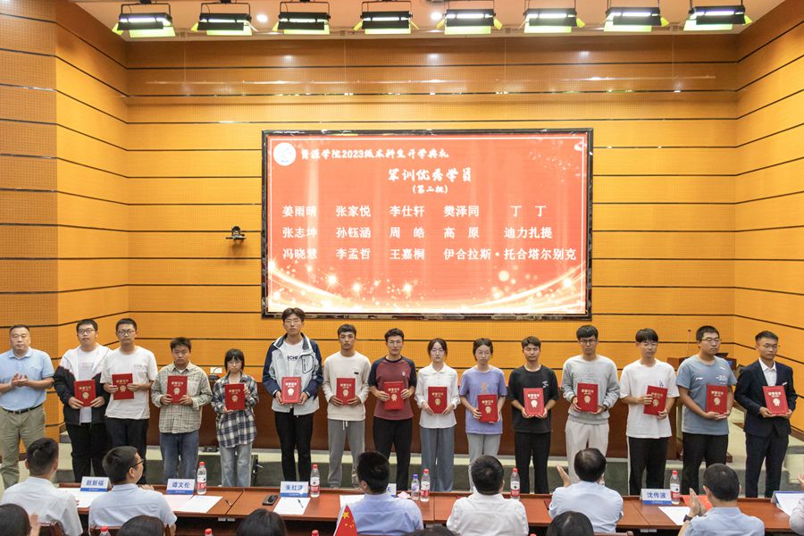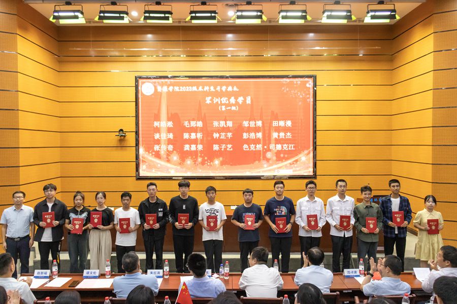 党委副书记谭文伦宣读军训表彰决定,对同学们发扬“求实进取,勇攀高峰”的院风学风,刻苦训练,敢于拼搏,争创一流表示肯定,希望同学们在今后的学习生活中团结互助,开拓创新,取得更大进步。宣读完毕,谭文伦副书记与朱红涛副院长共同为受表彰学生颁发荣誉证书。