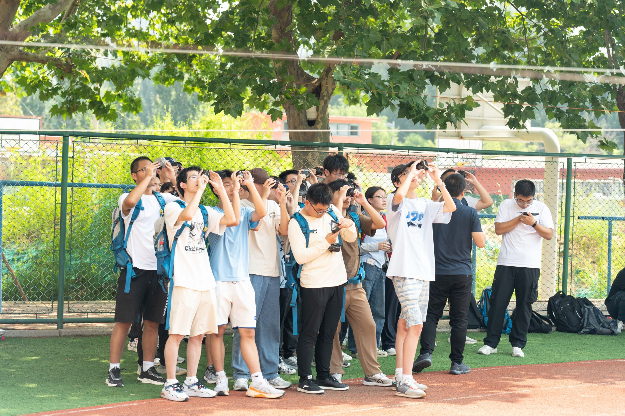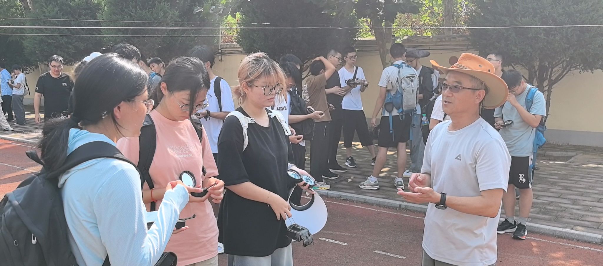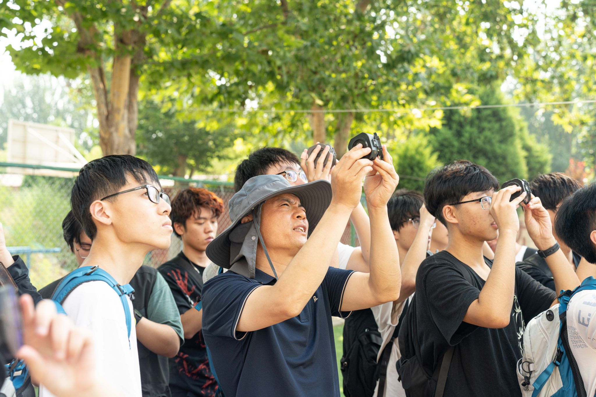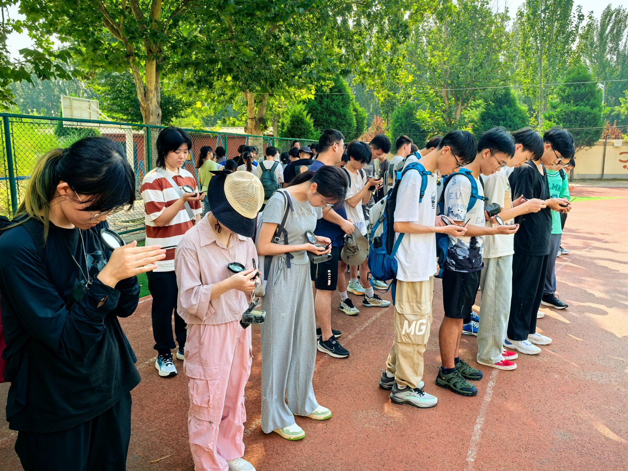 集中教学结束后,由带队老师带领各班级到操场进行分班教学,在老师们的指导下,同学们进行罗盘使用实操训练,调校磁偏角、测产状、测方位……同学们认真聆听、不断尝试,并进行实际操作演示。