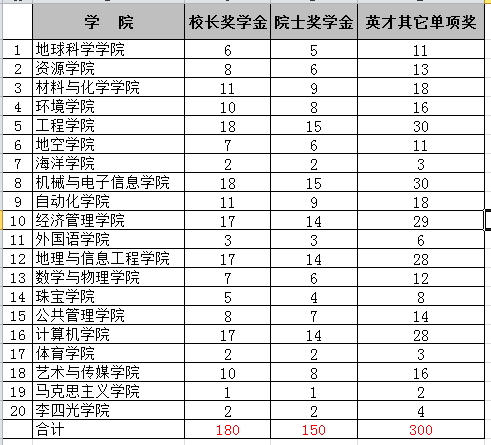“地大英才奖学金”(“李四光英才奖”、“少数民族学生奖”、“创业之星奖”除外)采取等额评选办法,各学院具体名额见下表。