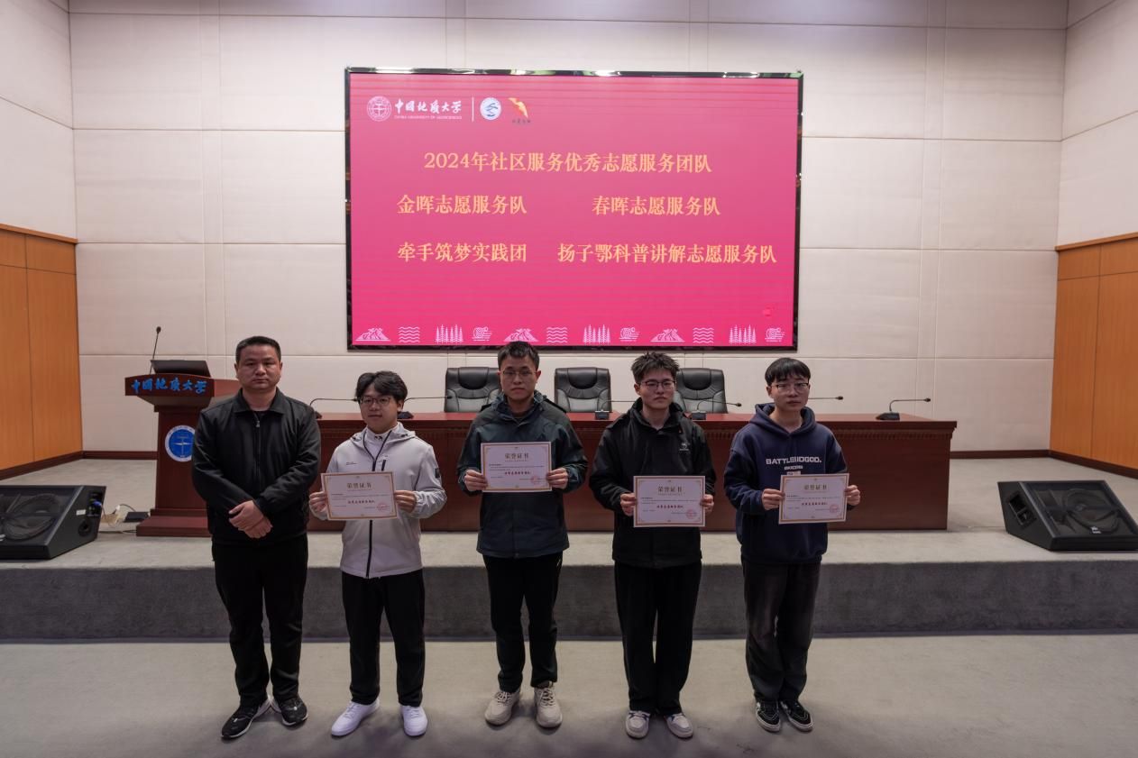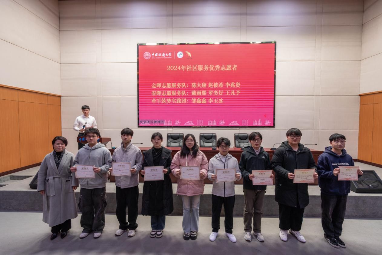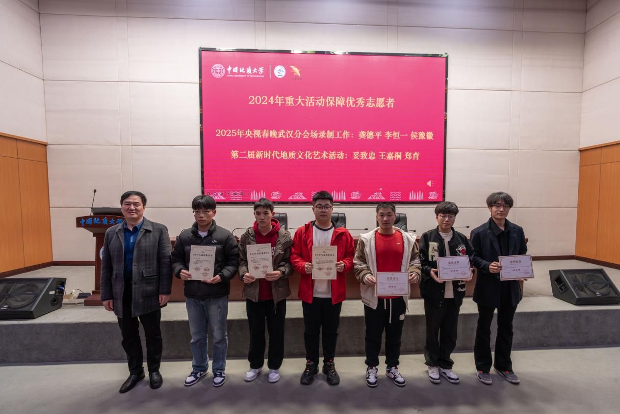 表彰环节,吴红莉为2024年社区服务优秀志愿者颁奖,李靖为2024年社区服务优秀志愿服务团队科普讲解、国旗护卫优秀志愿者颁奖,张宽裕为在第二届全国地质文化艺术节、2025年蛇年春晚武汉录制会场优秀志愿者颁奖。