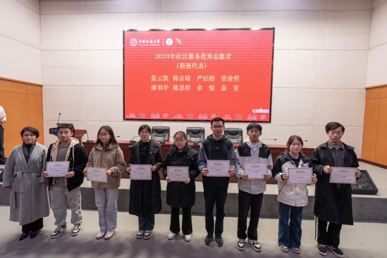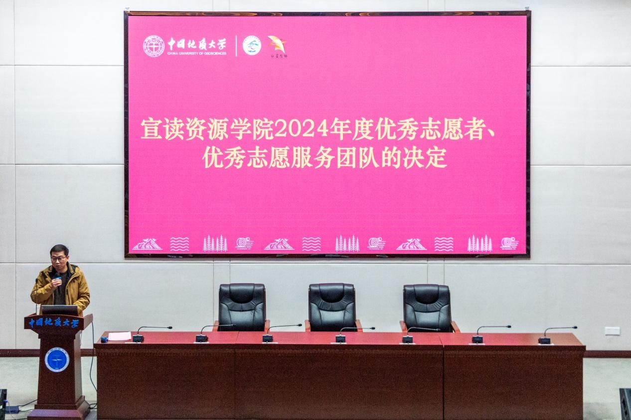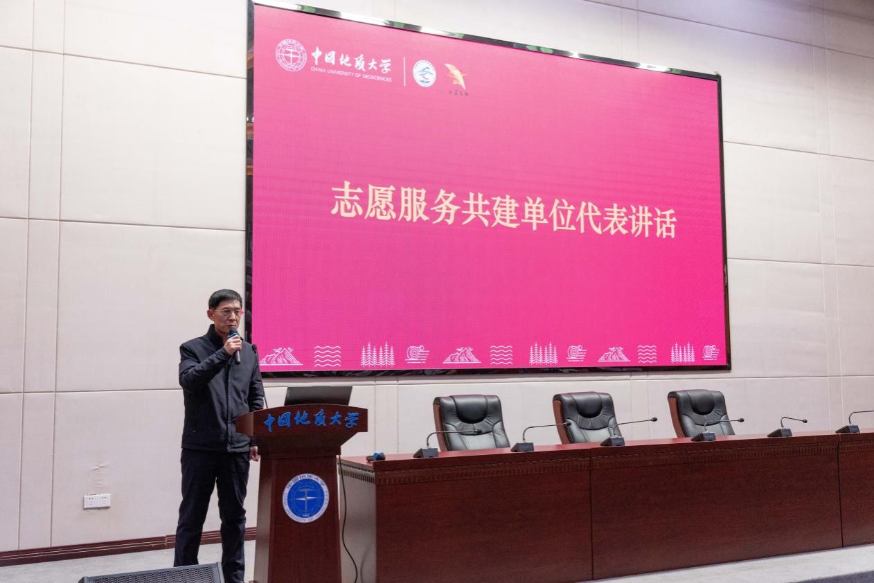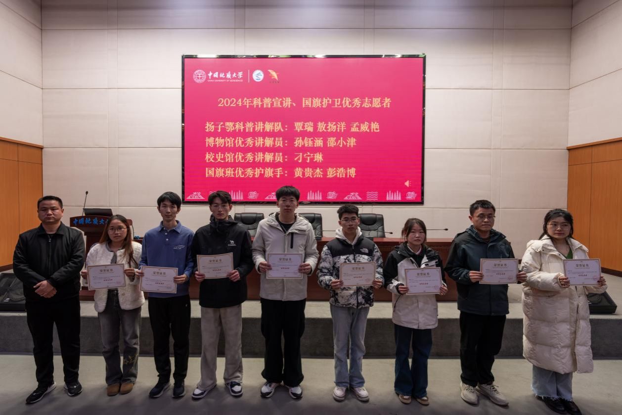 表彰环节,吴红莉为2024年社区服务优秀志愿者颁奖,李靖为2024年社区服务优秀志愿服务团队科普讲解、国旗护卫优秀志愿者颁奖,张宽裕为在第二届全国地质文化艺术节、2025年蛇年春晚武汉录制会场优秀志愿者颁奖。