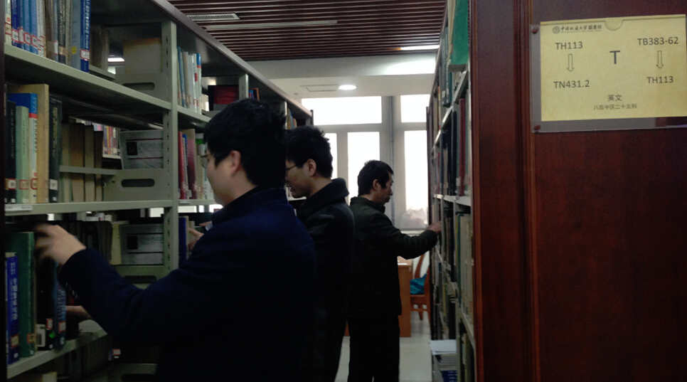 图3.党员帮忙整理外文书架