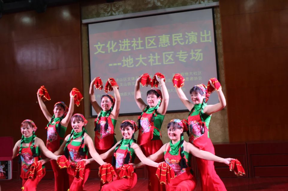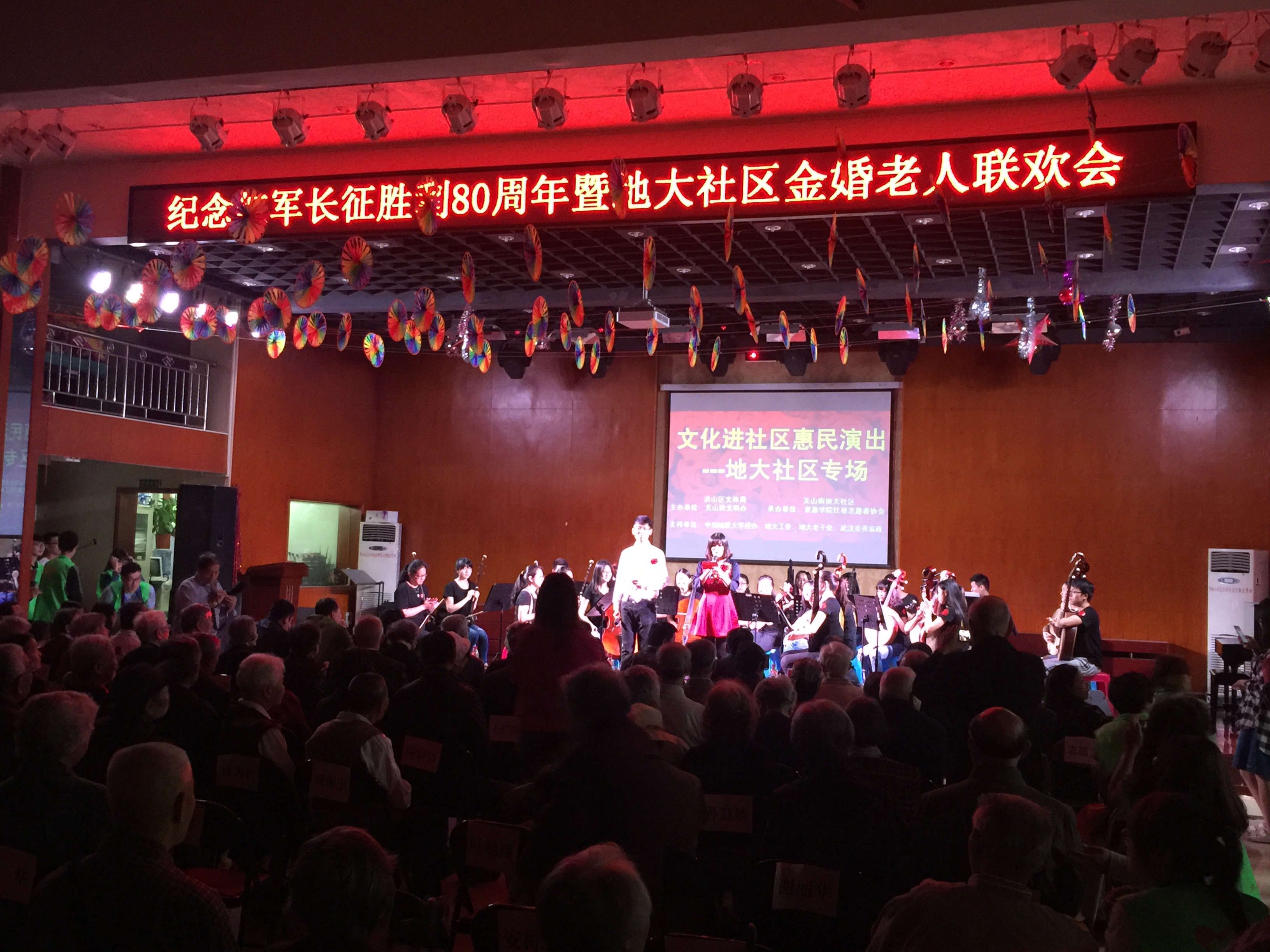 下午2点半,金婚老人们胸前戴着红花,手拉着手,在志愿者的搀扶和陪同下喜气洋洋的迈进了工会演播厅大门,随着民族乐器演奏《战士舞曲》的开始,联欢会拉开帷幕。除志愿者同学为此次联合会精心准备的节目外,其他节目都是由老人们自发建立的文艺组织进行表演,《情醉黄鹤楼》节目中,12位平均年龄60岁的退休女老师翩然地舞动,优雅地变换队形,一颦一笑丝毫不似花甲老人。一曲《刘海砍樵》节目中更是唱出了老人们的活力,赢得阵阵掌声。表演《刘海砍樵》的盛宏模老人今年已经80岁了,尽管高寿,但盛老师依然精气神十足,不仅歌唱的好,闲暇时还会带领地大社区的居民跳广场舞一起锻炼身体。谈到自己面对生活的心态时,盛老师引用了我国著名哲学家冯友兰先生的话:“微笑着面对生,优雅的面对老,从容的面对死。”在此基础上,盛老师又添加了自己的一句感悟“乐观的面对病”,这样,人生四大常事——生老病死就全都齐了。