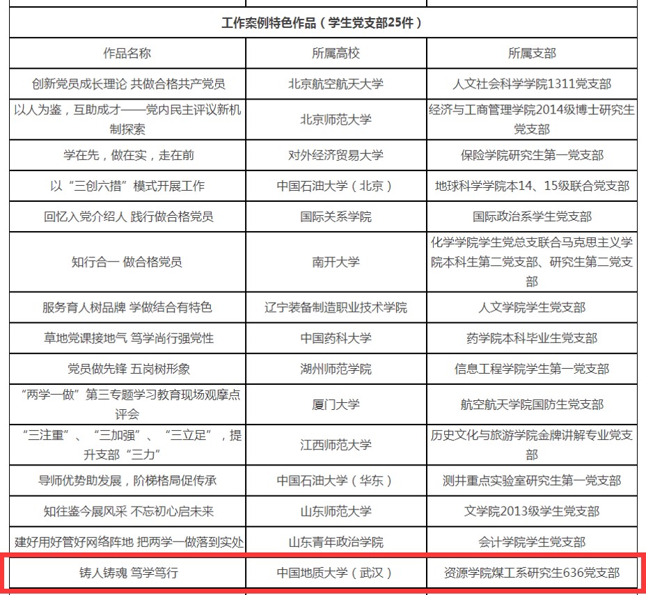 树立典型,加强宣传,学习效果持续提升。学院加强党徽照我行和示范党支部的培育工作,积极推荐优秀的支部和党员参加学校层面的评比。2016年研究生示范党支部评选活动中,煤工系研究生636党支部获评校研究生“十佳党支部”;在学校的十佳党员评选中,2013级林少伟同学获得了校级“十佳学生党员”称号。同时,学院还推荐煤工系研究生636党支部参与全国高校“两学一做”支部风采展示活动评比。近日,煤工系研究生636党支部作为正妹AV