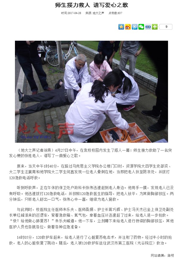 2017年4月27日13时40分,在路过马克思主义学院办公楼门口时,我院021133班学生史邵贤和021154班学生汪襄南以及地学院一名同学发现一位老人晕倒在地,当即把老人扶至阴凉处休息,并拨打120求救。在询问老人病情和家人信息时,老人突然再次昏迷,随后三名同学再次拨打120询问急救知识,在120指导下轮流进行心肺复苏,此时保卫处老师也及时赶到并联系校医院医生,14时05分,校医院医生赶来开展急救工作,经过多方人员近半个小时的努力,老人终于恢复心跳,随后被医护人员送往医院救治。