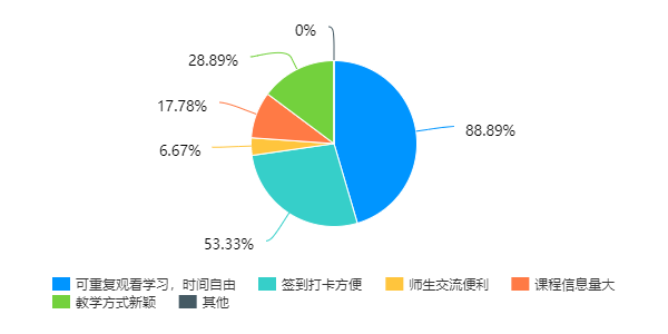 从同学们的自我评价来看,虽然线上课程弥补不了课堂监督缺失的缺陷,但大多数同学还是很自觉的,这主要体现在同学除听课外花费在本门课程的时间上:有57.78%的同学每周要花3-6小时在本门课程上,26.67%的同学则需要花费6-9小时,时间在9小时以上的同学也有13.33%。