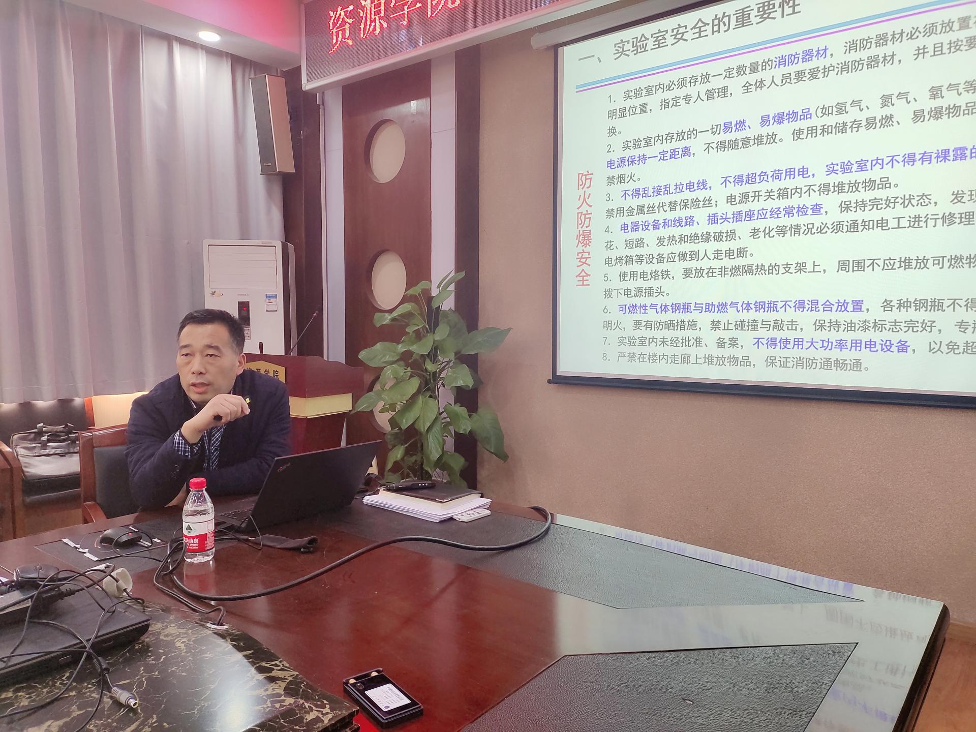 教学实验平台建设及管理”为题,详细讲解实验室安全的重要性、学院教学实验平台现况、问题及思考、实验室建设规划、物理空间分配等内容。他领学了各类实验室安全管理制度,通报了有关高校实验室安全事故典型案例和处理意见,并强调实验室安全是做好学院各项工作的基础和前提,要始终保持高度重视,长抓不懈,落到实处。他指出,学院实验教学平台现状存在人员匹配不均、实验室“三分散三公用”、实验设备陈旧、行业影响力和社会服务不足等问题。“十四五”建设期间,学院将整合教学实验室资源,重点建设专业性较强的教学实验室,加大资源开放共享;完善教学实验安全管理体系,整体提高实验室管理水平;推动新兴方向、线下-线上虚实联动实验平台建设,提高实验室建设成果,达到“建设系统、管理科学、制度完善、人员专职、资源共享、安全保障”,为学校教学实验平台“四横三纵”网格式布局奠定坚实基础。