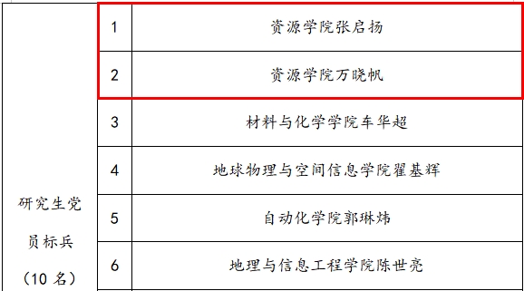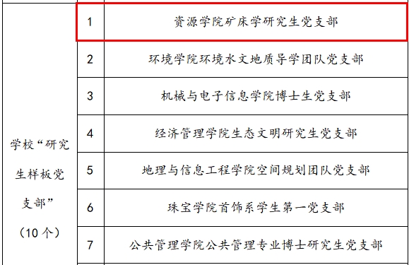 党委、石油工程专业本科生党支部以突出的创建成效顺利通过学校首批党建工作“标杆分党委(党总支部)”“样板支部”项目验收;同时,有5个项目获得第二批立项培育,其中资源科学与工程系教师党支部、石油地质系教师党支部入选学校党建工作“样板支部”、矿床学研究生党支部入选“研究生样板党支部”、张启扬和万晓帆入选“研究生党员标兵”的培育创建名单。