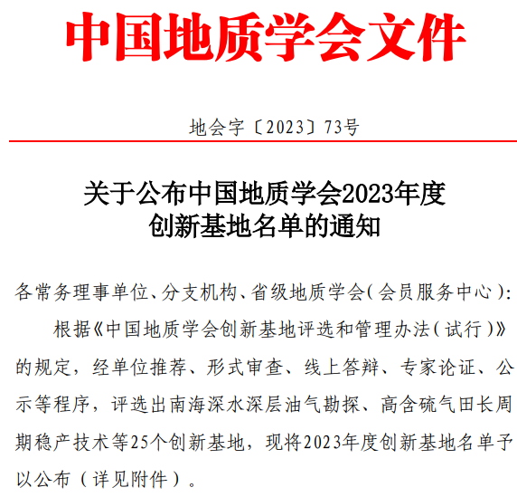 据悉,中国地质学会创新基地是推动产学研协同创新和地质科技成果转移转化的省部级科技创新平台,对于解决地学领域“卡脖子”关键技术,推动地质科技进步,助力经济社会高质量发展具有重要意义。中国地质学会创新基地于2022年开始评选,每年评选一次。