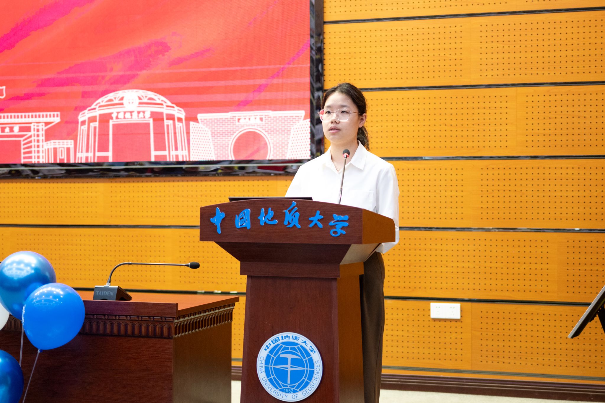 本科毕业生代表王雨乐发言。带着对师长、亲友的感恩,他感慨于四年的经历与成长,在大学中的所见所闻、所学所得、所思所感给予了他面对挑战的底气与砥砺前行的动力。即将入职紫金矿业集团、去到地质行业的第一线的他,励志为服务和保障国家能源资源安全贡献自己的绵薄之力。同时他祝愿同学作为新时代地大青年能够秉持坚守初心的执著和心怀家国的担当,在地质工作前辈的肩膀上顶起这一片赤红的天空,永远做肩上飞扬有风、心似滚烫火焰的有梦少年。