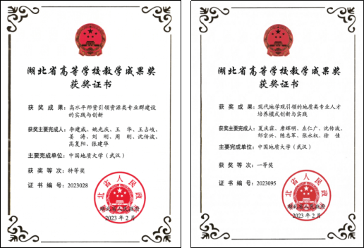 近年来本科教育教学成效显著,牵头获高等教育国家级教学成果奖二等奖1项,获湖北省高等学校教学成果奖特等奖1项、一等奖1项;新增国家级一流本科课程5门;获首届全国教材建设奖优秀教材二等奖1项;获批教育部资源勘查课程虚拟教研室;获批教育部第二批新工科研究与实践项目1项;新增全国模范教师1人、湖北省名师工作室1个和湖北名师1人、楚天名师1人、湖北“十佳师德标兵”1人、湖北“师德先进个人”1人;新增湖北省普通高校优秀教学团队1个、湖北省优秀基层教学组织4个;新增湖北省一流课程9门;获湖北省第八届高校青年教师教学竞赛工科组一等奖、第三届全国大学青年教师地质课程教学比赛一等奖、第四届全国大学青年教师地质课程教学比赛二等奖、湖北省高校教师教学创新大赛一等奖;获中国地质学会2020年度地质类工程专业优秀本科毕业设计3篇、2022年度地质类工程专业优秀本科毕业设计2篇;培养的学生涌现出中国大学生自强之星等各类人才。