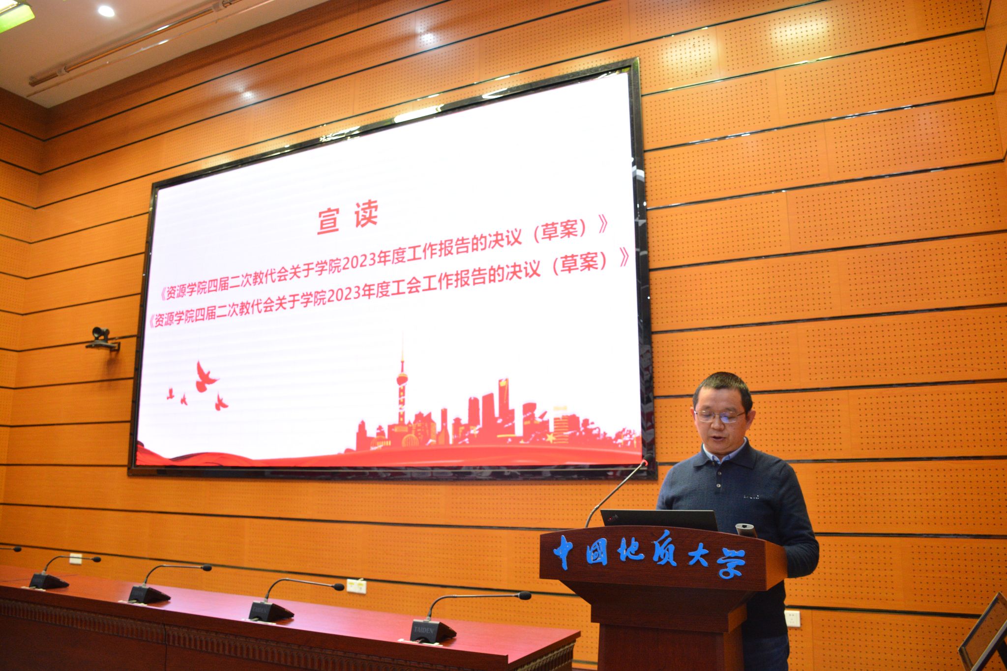 院长严德天作学院2023年度工作报告。报告从党建与思想政治、学科建设、师资建设、教育教学与人才培养、科学研究与社会服务、实验室与平台建设等方面对2023年的工作进展和主要成绩进行了全面回顾和总结,分析了新形势下学院事业发展面临的重大机遇和现实挑战,明确了下阶段工作总体思路、重点任务和具体举措。他讲到,学院在过去的一年里,坚持以高质量主题教育推动高质量发展,深入学习贯彻党的二十大精神和习近平总书记重要回信精神,贯彻落实学校第十三次党代会决策部署,紧抓“双一流”建设和“新一轮找矿突破战略行动”等重大机遇,坚持和加强党的领导,打造一流党建工作体系,大力加强学科、人才与师资队伍建设,全面推进一流本科建设,持续加强和改进研究生培养管理,深入推进有组织科研,持续拓宽行业科教服务和国际合作交流,积极改善办学基本条件,有力加强双创和校友工作,在建设资源能源领域一流研究型学院征程上取得重要进展。他表示,学院将持续深化综合改革,推动更高水平开放、更深层次改革、更高质量发展,为学校建设地球科学领域世界一流大学、服务国家资源能源事业高质量发展贡献智慧和力量。接着,严德天向大会报告了学院2023年度财务情况并介绍了年度绩效考核奖励方案。
