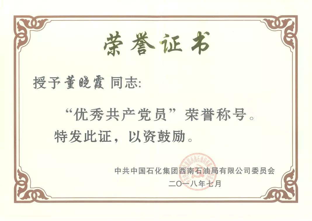尽心尽力助防疫,特殊时期勇担当。2020年1月新冠肺炎疫情爆发以来,董晓霞坚守成都担负起所疫情防控第一责任人的重担,第一时间落实部署所疫情防控工作,春节假期切实担负起“娘家人”的角色,通过微信群、钉钉群、电话等切实做好每日防疫提醒,及时掌握全所55名员工情况,积极协调页岩气现场工作组值班人员防疫物资并督促及时撤回,重点关注疫区返回及被困疫区员工情况,尽所能做好心理疏导,积极提供帮助,及时上报情况,实现全所零报告;春节期间除了疫情防控,还持续抓好现场跟踪工作,负责页岩气重点探井、产建井的跟踪协调,及时掌握21口正钻井、11口测试井情况,返岗复工期间积极协调部署页岩气生产科研工作,组织好员工居家办公,细化分工、抓好落实,确保页岩气各项重点任务不落后。所在支部获分公司战役青年突击队荣誉。