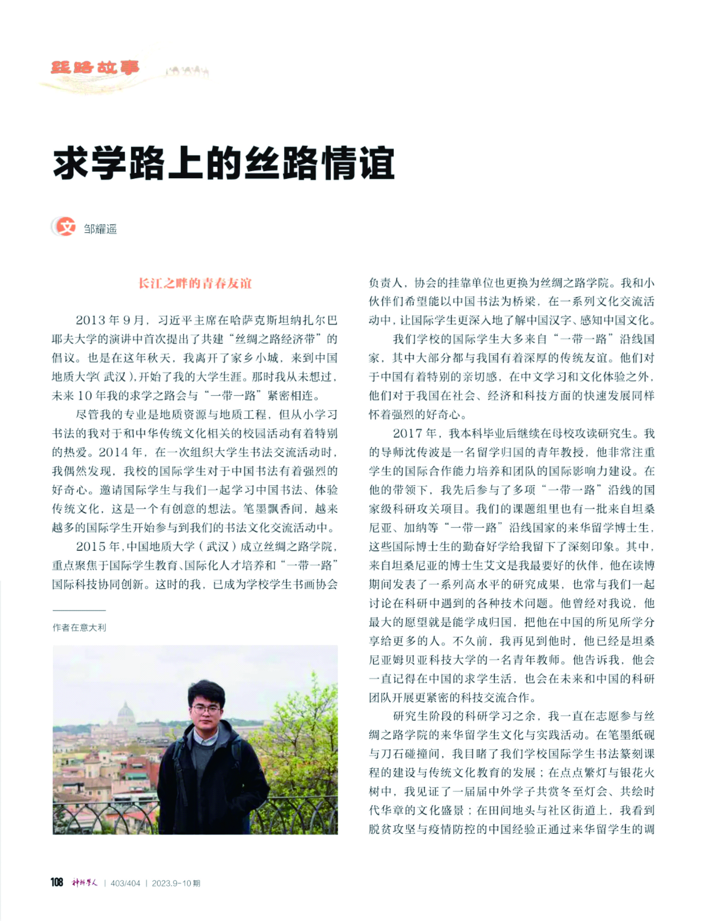 博士生邹耀遥在《神州学人》“一带一路”十周年特刊发表了题为《求学路上的丝路情谊》的文章。