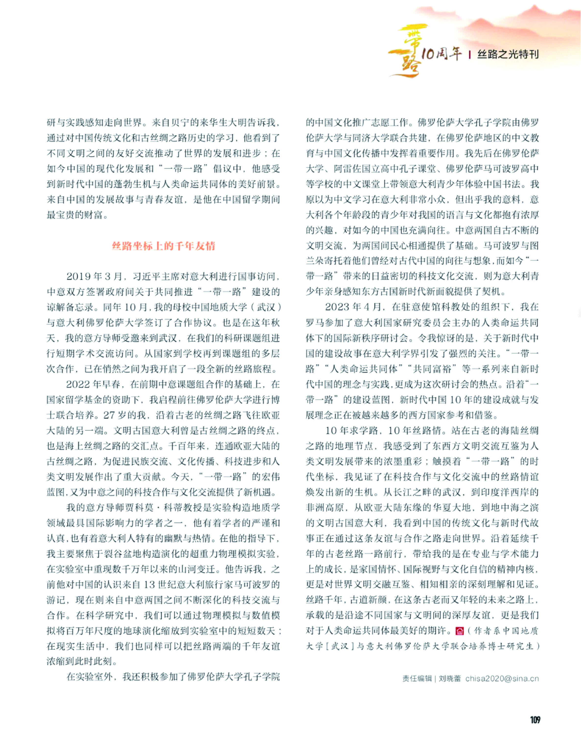 (武汉)与意大利佛罗伦萨大学的十年求学路上对“一带一路”建设的切身见证和深刻感悟,展现了我院学子在专业学术能力上的成长和家国情怀、国际视野与文化自信的精神内核。